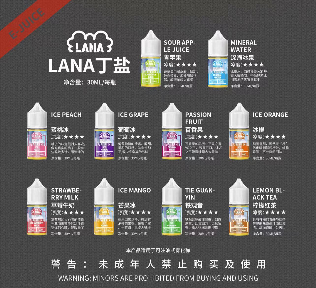 LANA 電子菸油以 “極冰口感” 和便捷性為核心賣點,通過陶瓷芯霧化技術和尼古丁鹽應用,為用戶提供高還原度的口味體驗。